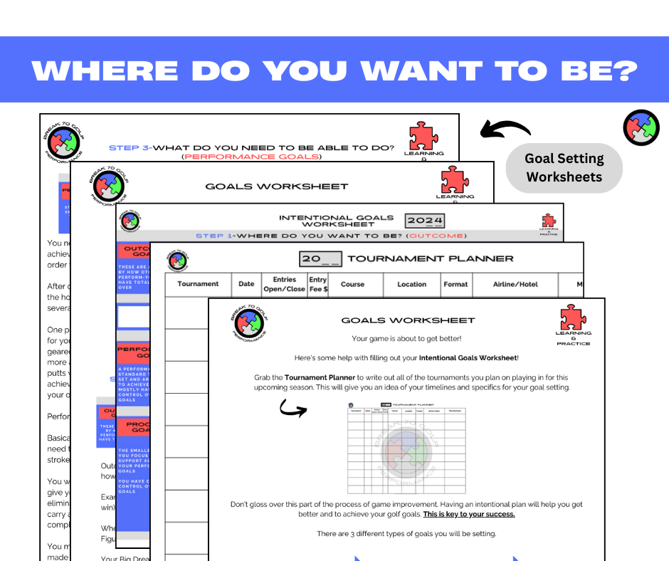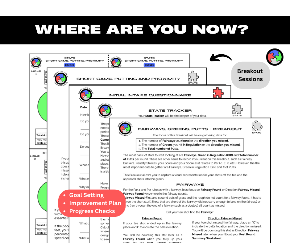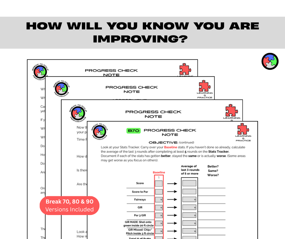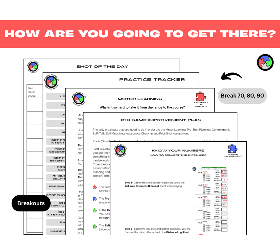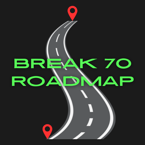 The Break 70 Roadmap simplifies the improvement process into four key areas—each acting as a puzzle piece to your success! This program is packed with printable worksheets, trackers, and interactive exercises designed to guide you from the practice range to the course.